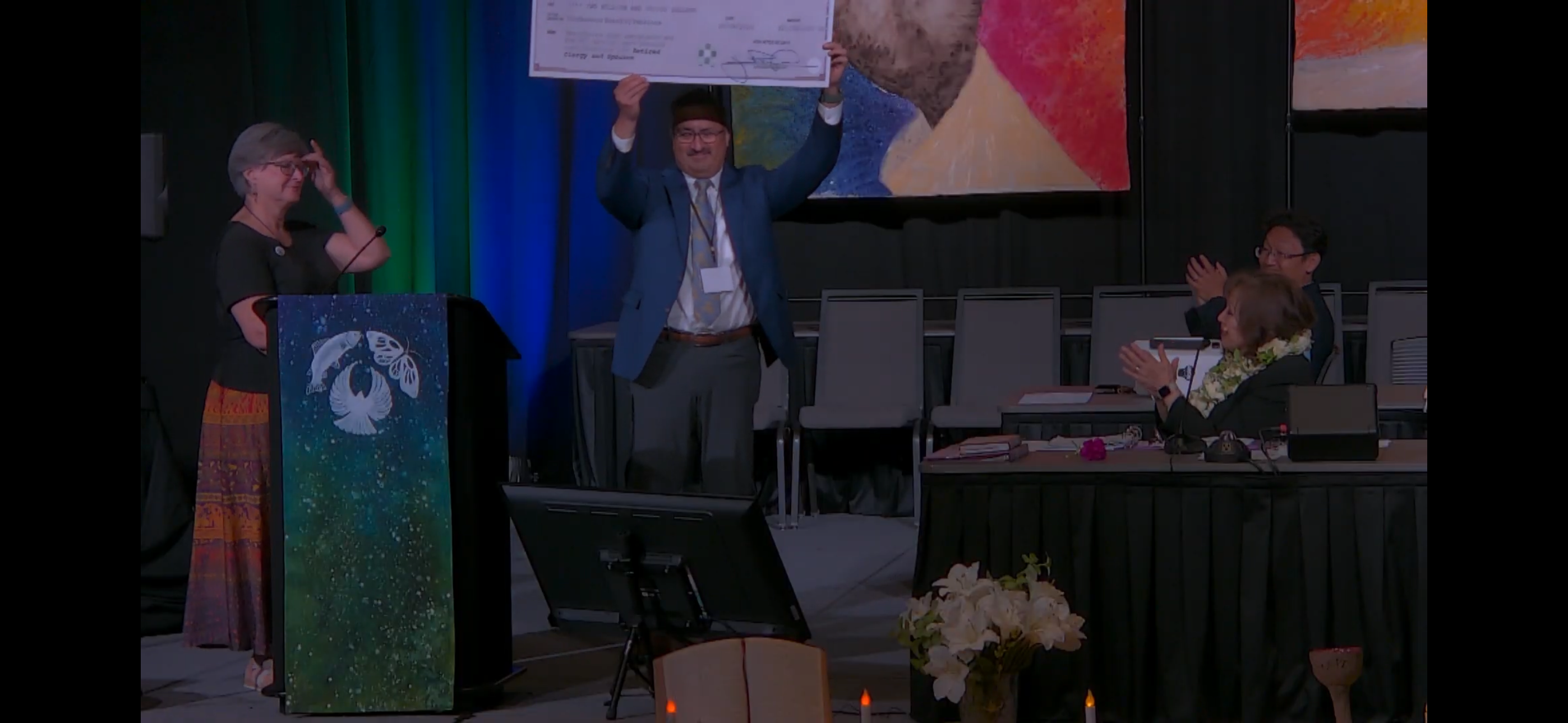 Shown Above: Mr. Paul-Extrum Fernandez accepts the $2 million grant to the Conference Board of Pensions from Endowment Board President, Ms. Mary Popish, at the 2024 Annual Conference Session.